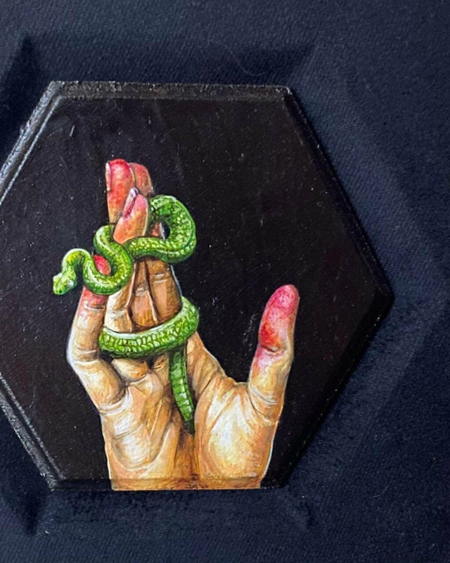 Enmarcado de estructura hexagonal realizada en madera natural sin tratar. Interior con revestimiento en terciopelo negro. La obra se encuentra encastrada en una cavidad central del terciopelo - 10 x 10 cm